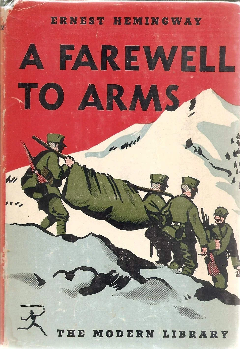 • Cover of a book titled 'A Farewell to Arms' by Ernest Hemingway, featuring a drawing of soldiers ascending a snowy mountain with a backdrop of snow-covered peaks.